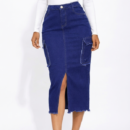 The Utility Cargo Denim Midi Skirt is designed to blend modern edge with everyday functionality. Featuring a structured silhouette with statement cargo pockets and a front slit detail, this skirt offers a flattering fit while adding a bold, street-style touch to your wardrobe.